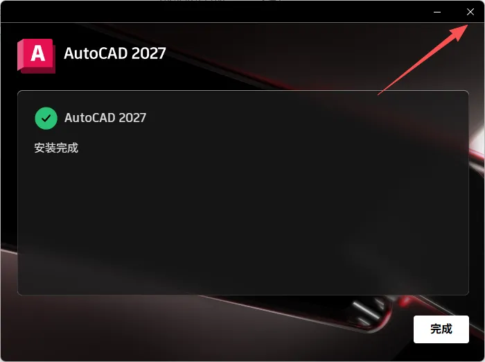 8、安装 AutoCAD 2027完成,点击X关闭,不要点击开始