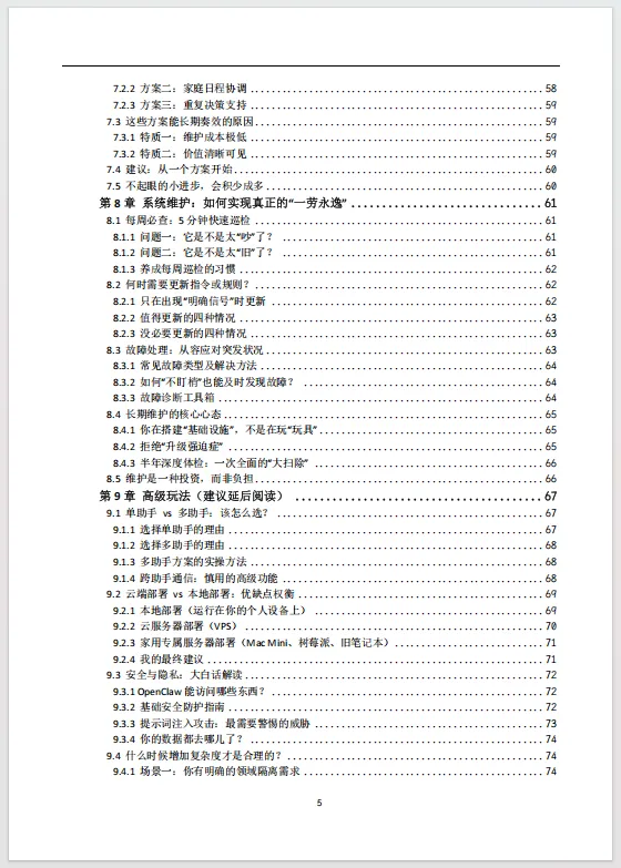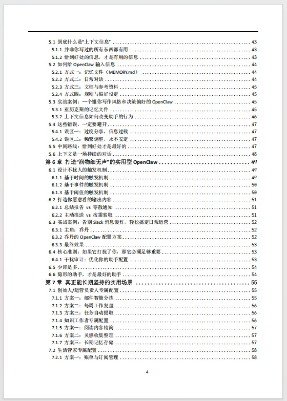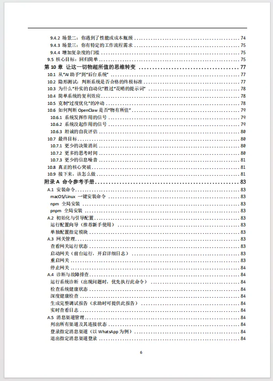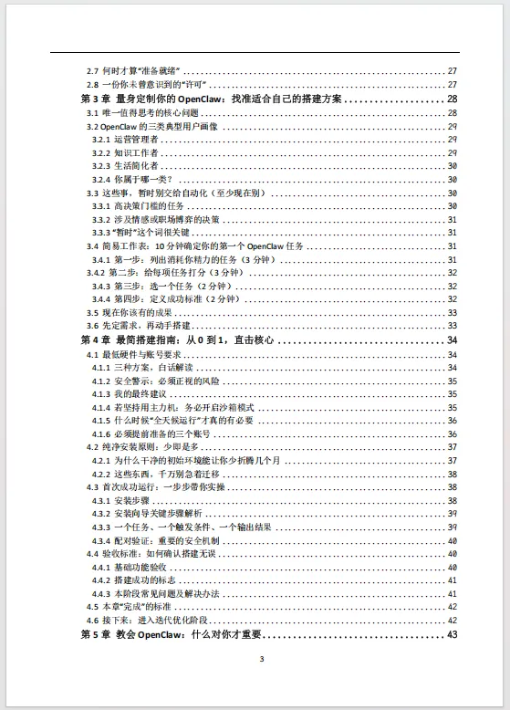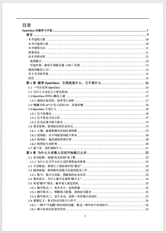 这份《OpenClaw实操学习手册》102页,精准地填补了个人AI助手技术从概念走向日常实用之间的关键鸿沟。当前,以OpenClaw为代表的自托管AI网关技术,其潜力虽被广泛认知,但实际部署与有效使用的门槛却将绝大多数感兴趣的非技术用户拒之门外。官方文档与社区讨论往往充斥着专业术语并预设了相当的技术基础,导致新手在尝试之初便陷入迷茫与挫败,大量探索止步于“望而生畏”的阶段。首先完成了至关重要的“祛魅”工作,清晰界定OpenClaw“是什么”与“不是什么”,将用户期待从对“魔法”的幻想拉回至对“工具”的务实认知。它深刻剖析了导致人们放弃的普遍心理与技术陷阱,如宣传造成的过高预期、术语壁垒以及教程中隐而未提的前提条件,从而在心理层面为用户“松绑”,赋予其“从小处着手亦为成功”的合理许可。引导用户在动手前先行完成自我诊断,通过明确的用户画像归类与简易工作表,帮助其定位真实痛点并定义首个具体、可衡量的自动化任务。这种“先定需求,再谈技术”的路径,彻底扭转了常见的盲目搭建、最终不知所用的失败模式。随后的最简搭建指南、上下文教学、安静实用设计原则及长期维护策略,共同构成了一条从零到一、持续迭代的清晰行动路线。将OpenClaw从一项新奇技术或交互式聊天玩具,重新定位为一项应融入背景、持续提供价值的“个人基础设施”。它倡导的价值衡量标准并非炫酷的演示,而是“润物细无声”的日常改善——更少的决策消耗、更多的思考时间与更少的信息噪音。通过强调简单胜过复杂、稳定胜过新颖、实用胜过炫酷的核心原则,手册旨在帮助用户构建的不是一个短期试验品,而是一个六个月后依然在可靠运行并创造复利价值的系统。因此,它不仅仅是一份操作说明书,更是一份旨在让先进AI技术真正为普通人所用、提升其生活与工作质量的赋能蓝图。