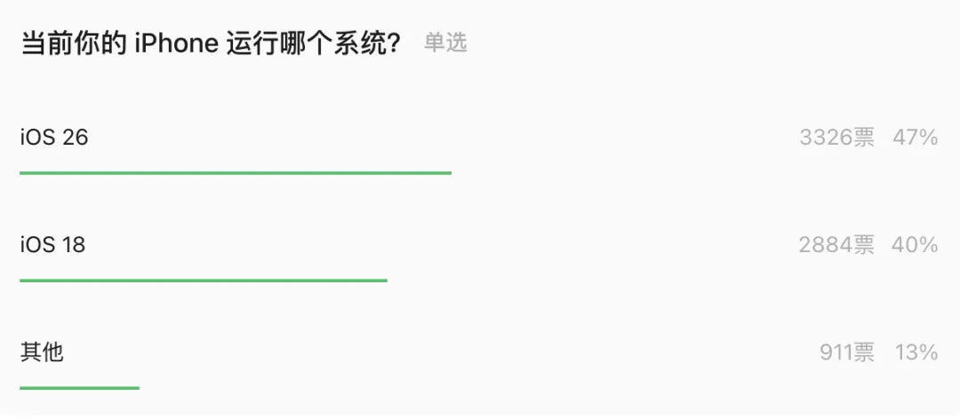 另外,昨天我们也做了一个简单的用户调查,结果有些出乎意料:虽然 iOS 26 用户占多数,但仍有约 40% 的用户停留在 iOS 18。