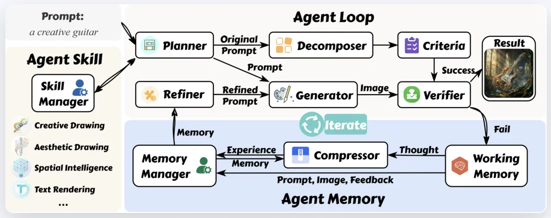 这项研究不仅在多个主流与专业基准上实现了显著性能提升,更重要的是证明了轻量化基础模型在智能体架构加持下,可以超越更大、更强的闭源模型,为低成本、高效率的多模态生成提供了新路径。
