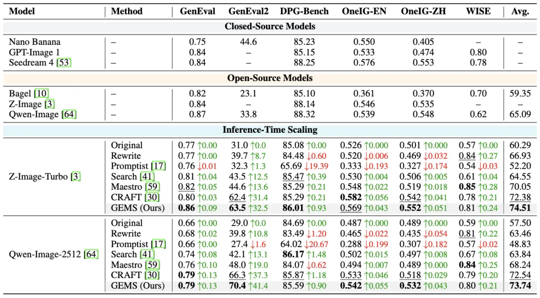 具体而言,在轻量化蒸馏模型Z-Image-Turbo上应用GEMS后,模型在主流基准任务上的平均性能提升达到14.22,在下游任务上平均提升14.03,让6B参数的Z-Image-Turbo在GenEval2上超越了当前最优模型Nano Banana 2。