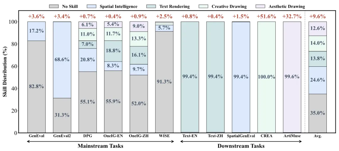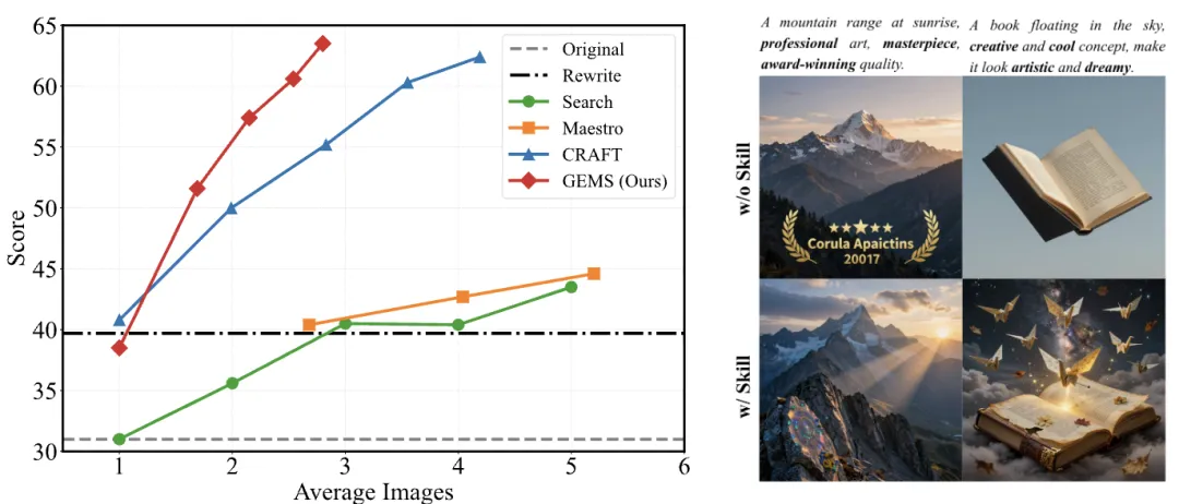 研究人员还发现,GEMS能够根据用户提示自主触发对应技能,显著提升整体视觉美感与构图质量,智能体技能通过在特定生成维度上提供针对性增强,有效提升了主流任务的性能。