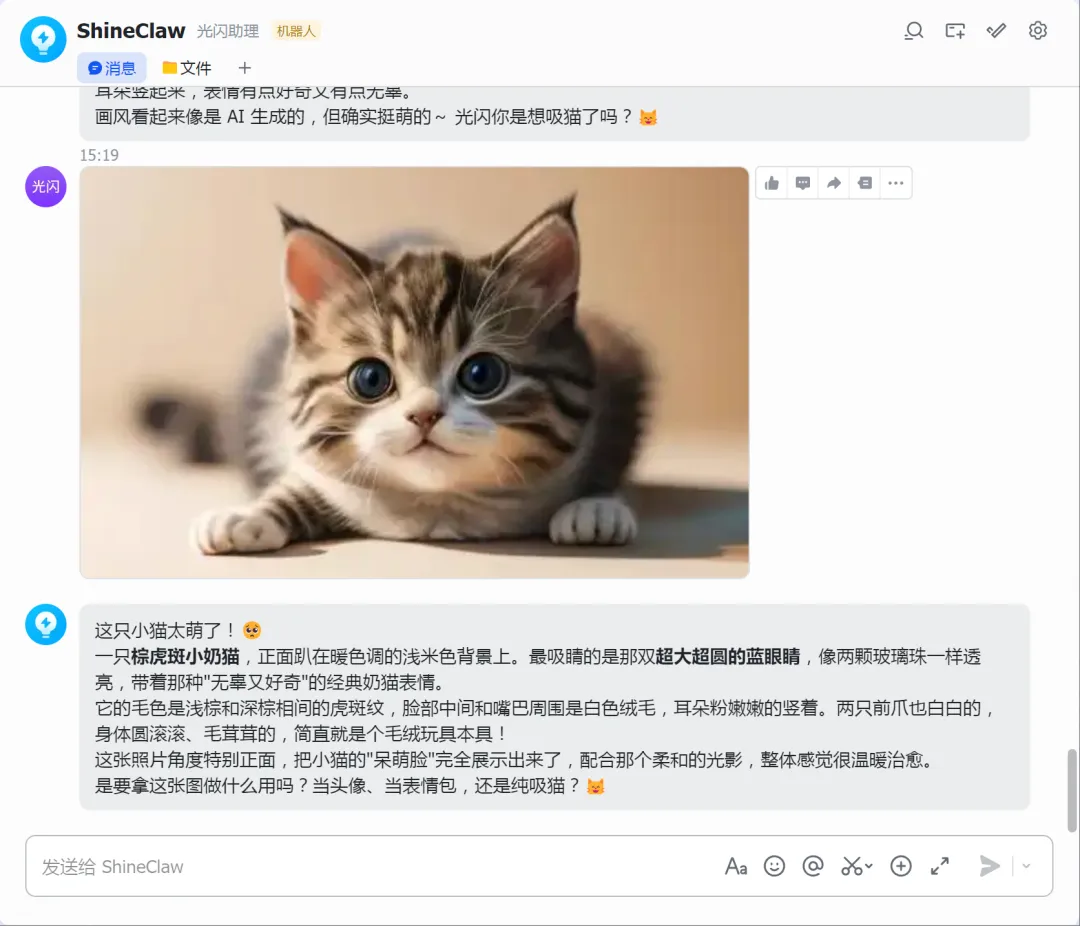 在飞书里直接发一张图给 OpenClaw,看它能不能描述内容。
