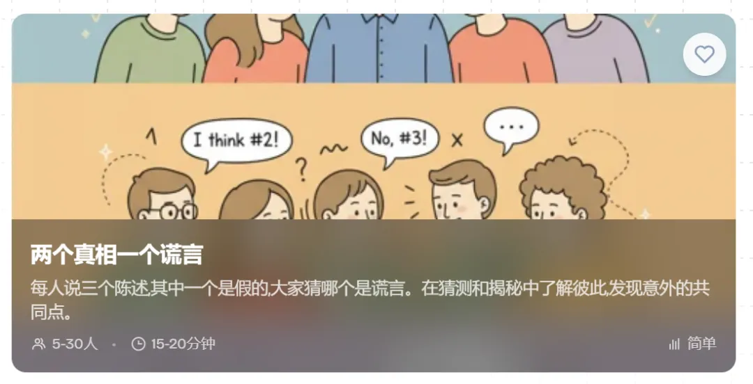 其实不妨可以看看一些小游戏,不管是谁,是啥场景它都能用,简直是冷场救星。尤其是大学生们在搞社群活动,打工人在搞团建活动的时候,它都格外好使。关键它还特别贴心,根据人数规模都分好了分案,就连小白都能轻松胜任主持人。