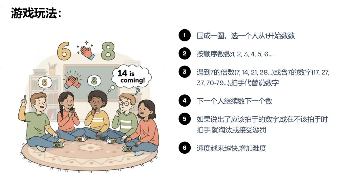 而且要是报数快的话,脑子就得飞速转动起来,越到后面的数字就越难算。这个时候,就得记起我们的乘法表咯。