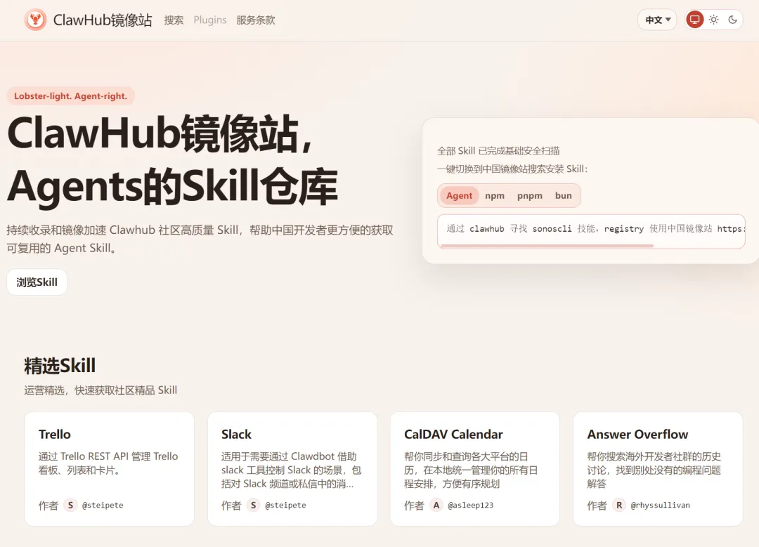 • 速度快:火山引擎国内 CDN 加持,秒开技能页面• 更稳定:再也不用担心 API 限速和加载报错• 中文友好:支持中文搜索、精选 Skills 推荐• 生态兼容:腾讯 QClaw、字节 ArkClaw、百度 DuClaw 也能用