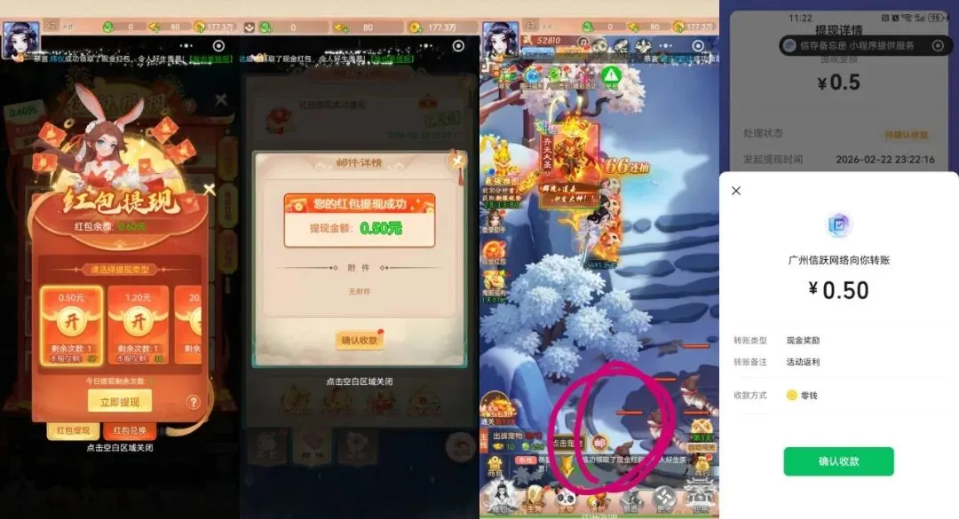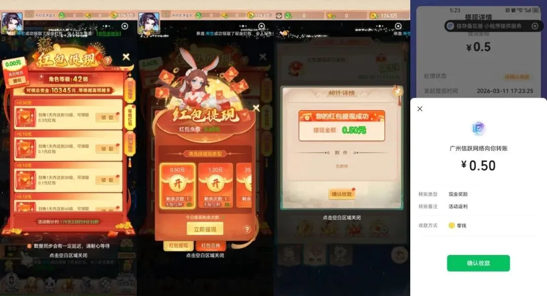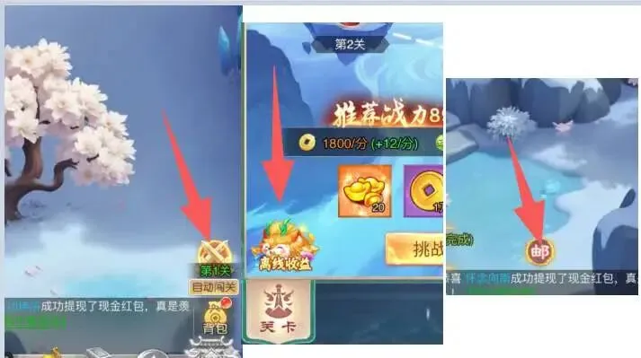 三个游戏玩法一样的,按图操作,进去直接右下角闯关离线收益免费获取,然后去领等级红包秒到0.3-0.5,在邮件手动领,【0.5没名额的删掉小程序重新进,然后换服选择新区】实在没有就换0.3提现,超级简单,提现秒到。(之前玩过的也可以换新服,同一个游戏总共能提一次0.3和一次0.5)