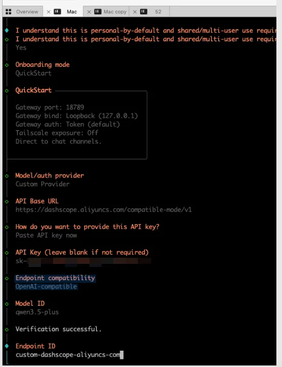以上输入完成后,会进行一段时间校验。成功后会有提示,再继续下一步。配置成功后,OpenClaw 的核心能力就已经可以用了。4. 访问页面