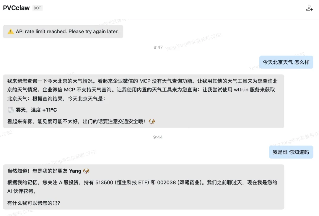 企微扫码接入:选择扫码接入,并使用企业微信扫描二维码。一键创建机器人:无需更多配置,只需点击一键创建机器人。自动接入 OpenClaw:成功创建机器人后,无需手动配对,即可自动接入本地 OpenClaw。你可以点击「前往使用」开始和小龙虾对话。企业微信绑定成功后,就可以愉快地和自己的小龙虾聊天了。这个机器人可以添加到群里,不过按我目前的测试结果,绑定企业微信的机器人只响应我个人的指令。7. 踩坑与建议