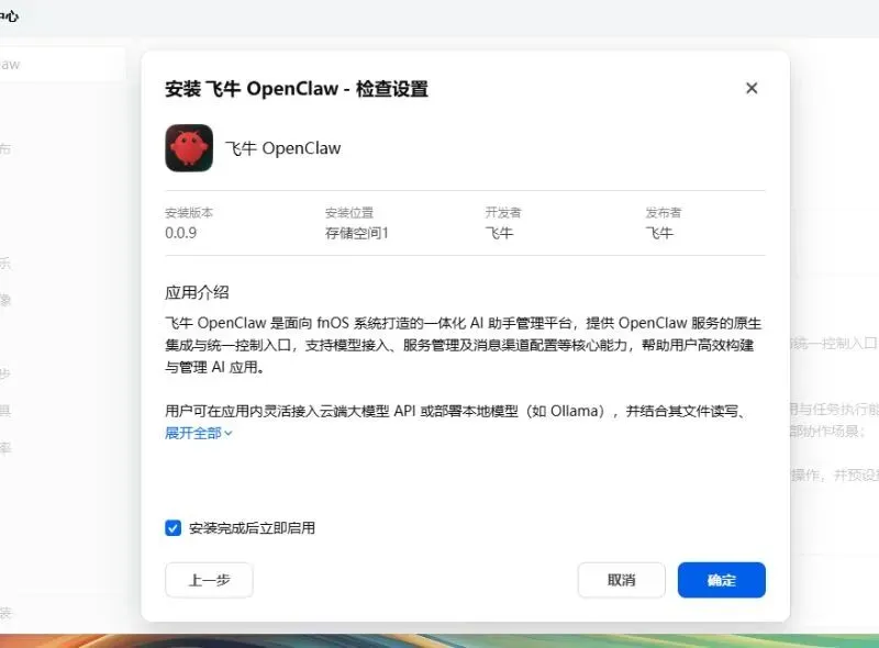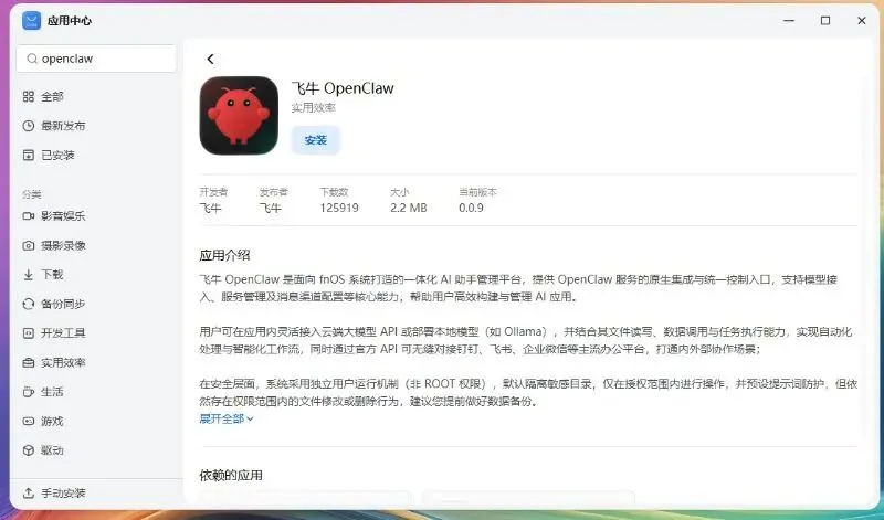 在飞牛商店中下载Openclaw