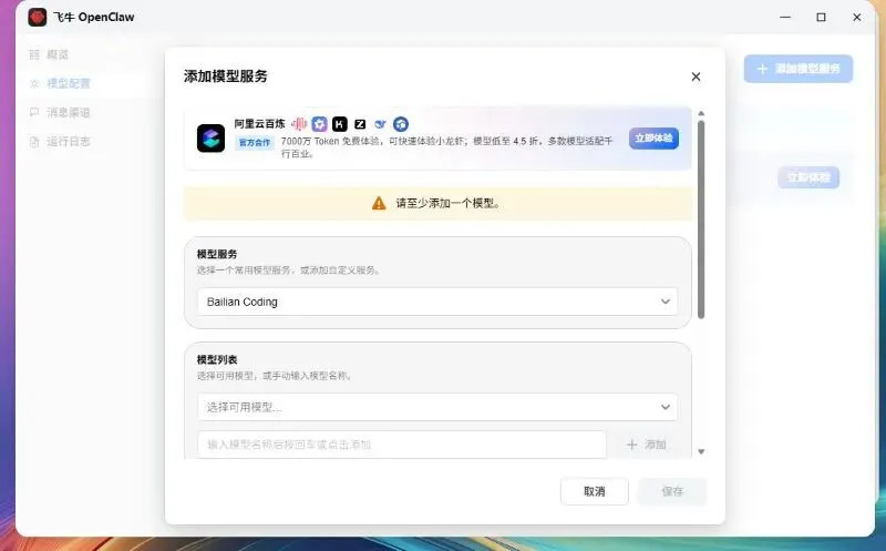 配置模型,这里我选择的是阿里百炼的Codingplan,用这个可以不用担心token消耗的问题,基础版就够咱们大部分人使用了。