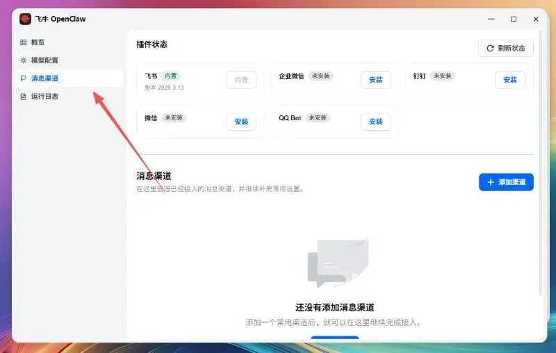 默认带的通道是飞书的通道,可以添加飞书机器人,这里我们选择安装一下微信通道插件,直接点击安装就好。