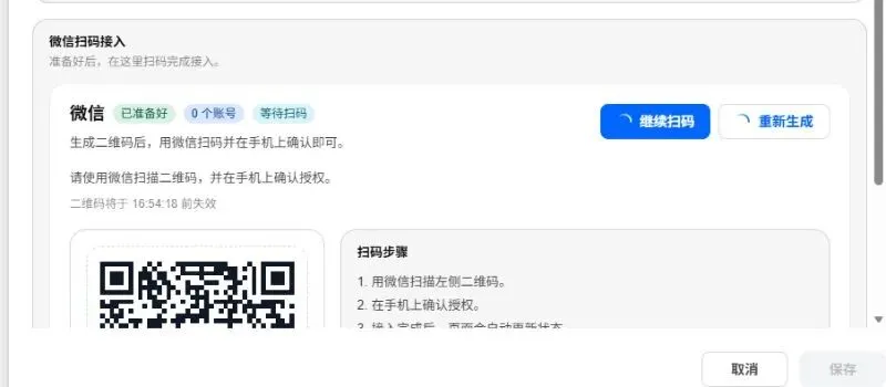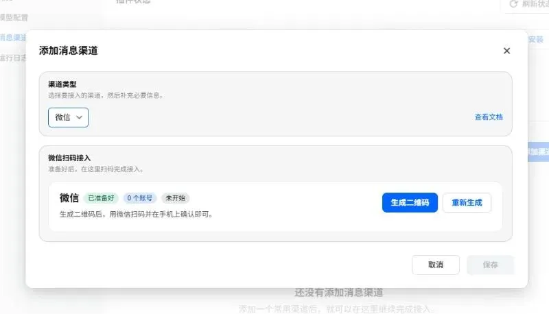 重启完成后,点击添加渠道,选择微信通道,用二维码扫码登录就可以