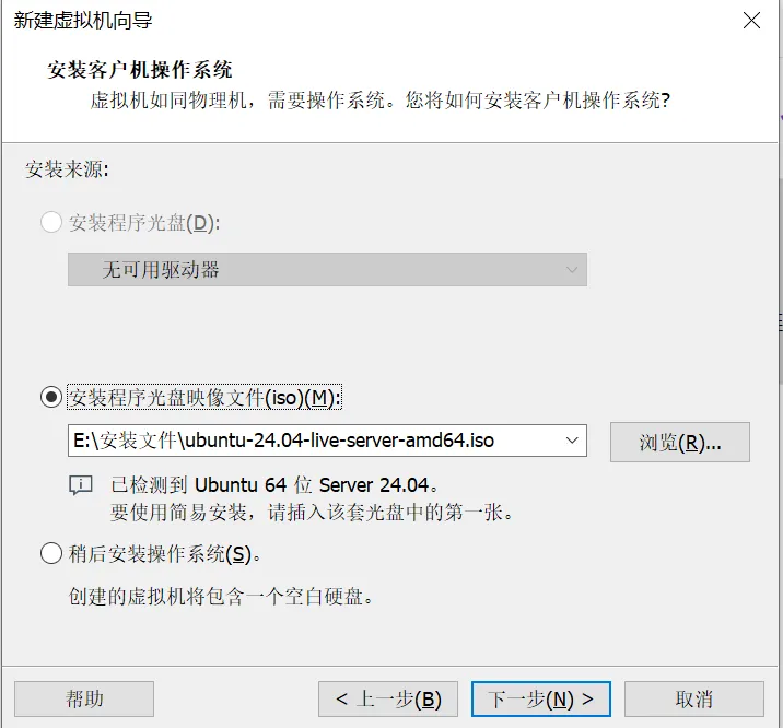 勾选「安装程序光盘镜像文件(ISO)」,点击「浏览」,选中我们提前下载好的Ubuntu.iso文件,点击「下一步」(VMware会自动识别系统版本,无需手动选择)。