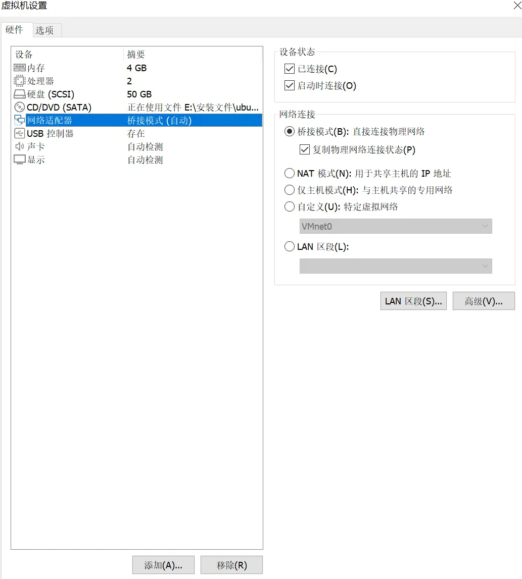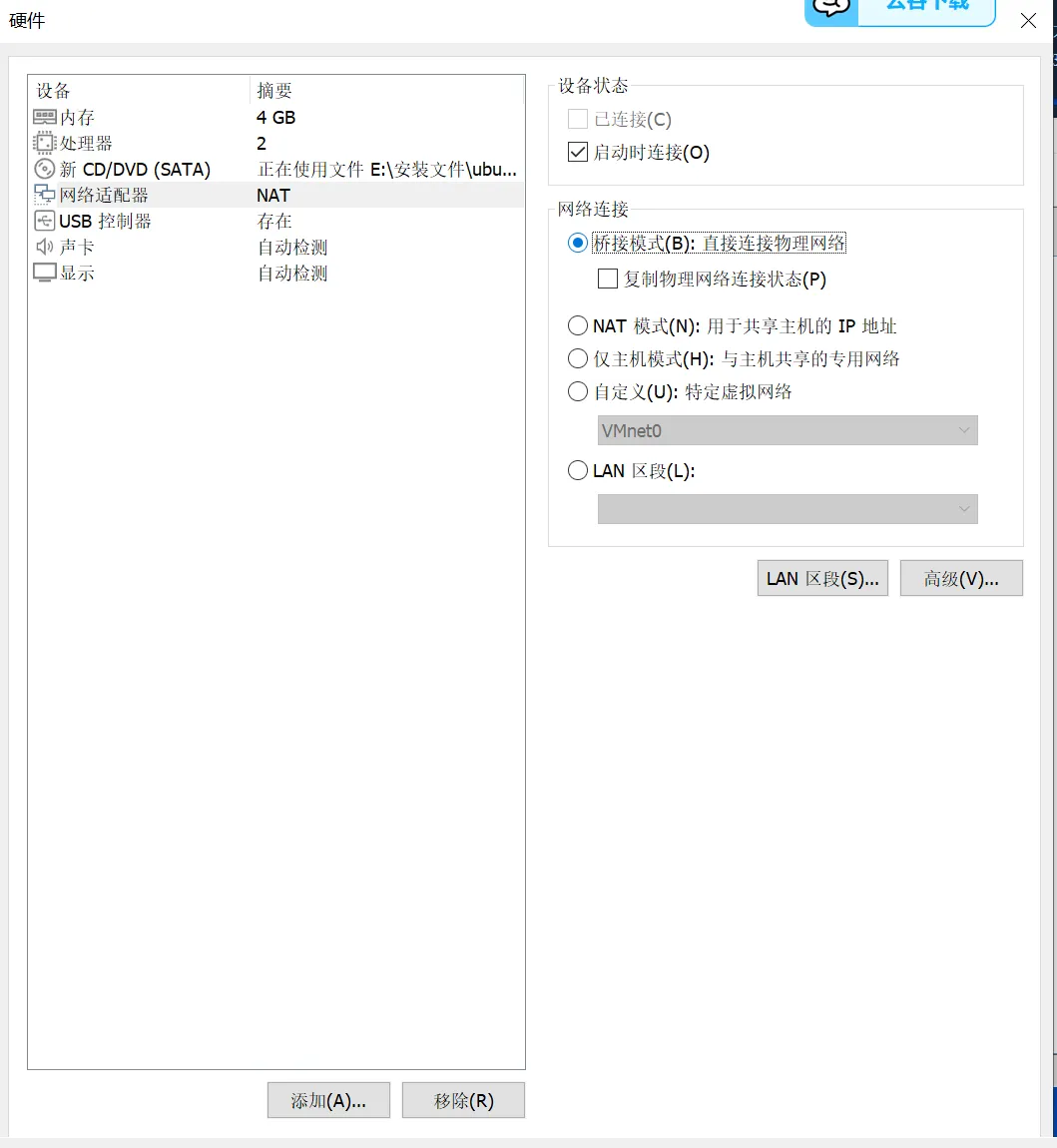 - 网络适配器:保持默认「桥接模式」虚拟作为独立服务器资源;