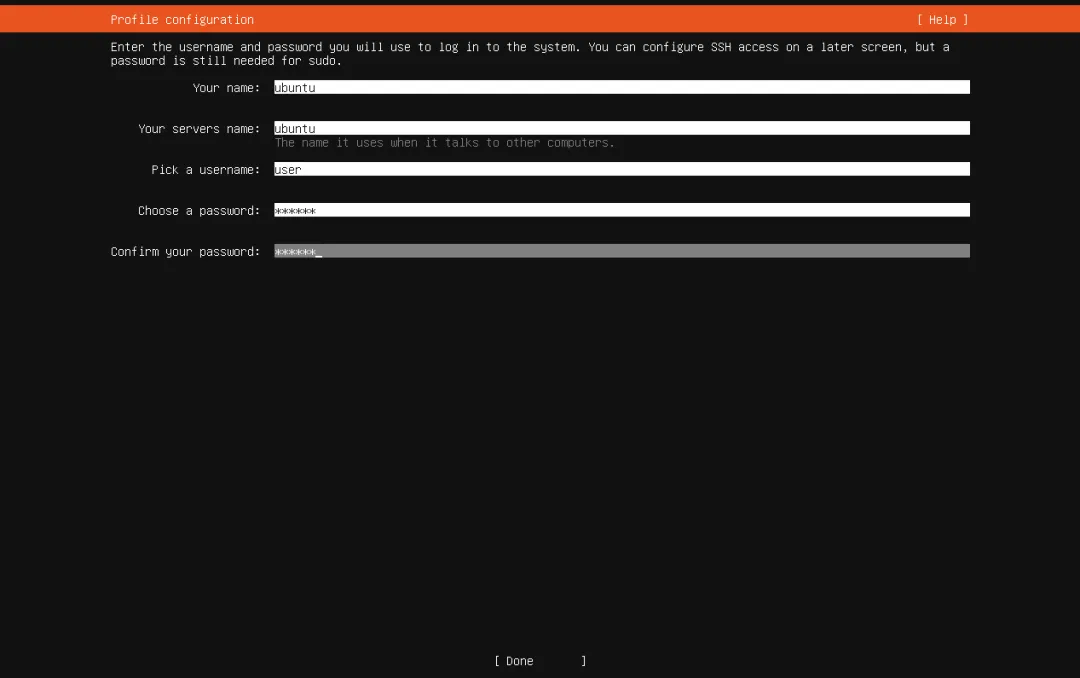 - Password(密码):设置一个简单好记的密码(比如123456,仅用于虚拟机,无需担心安全);