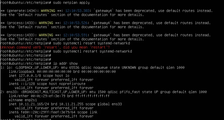 #应用配置更改sudo netplan apply#重启网络服务sudo systemctl restart systemd-networkd