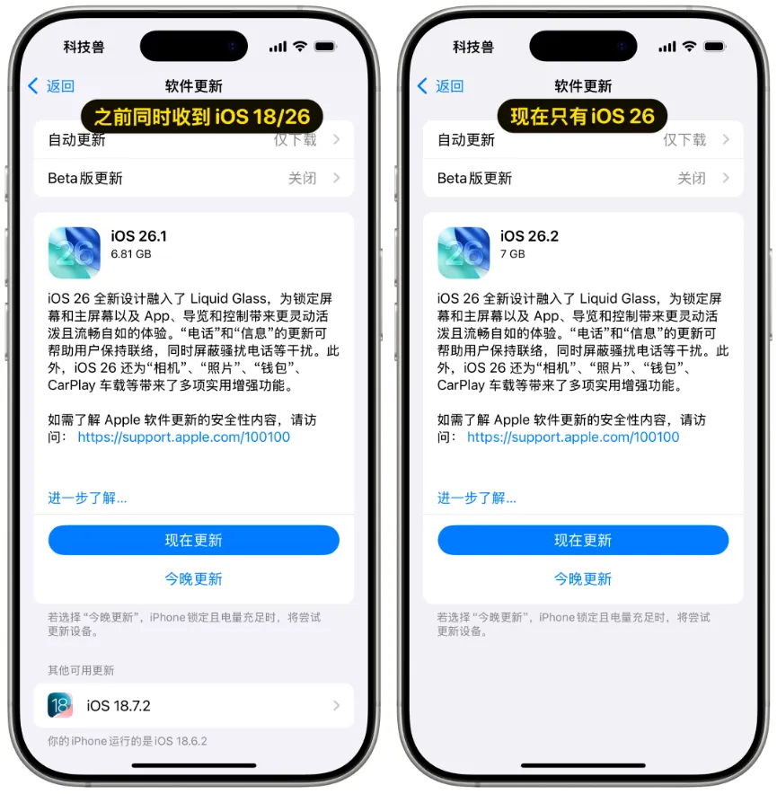 一直以来,苹果对于系统更新有着明确的规划,对于能够适配最新iOS 26系统的机型,比如iPhone XS、XR及后续机型,通常在新系统发布一段时间后,会停止旧系统的双版本更新服务,引导用户统一升级到最新系统,部分用户选择留在iOS 18,多是出于对系统设计、耗电情况或稳定性的考量