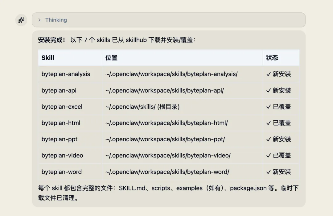 帮我从 skillhub 上下载安装 byteplan-analysis, byteplan-api, byteplan-excel, byteplan-html, byteplan-ppt, byteplan-video, byteplan-word这些skills到 ~/.openclaw/skills 中, 可以直接通过这个地址 https://lightmake.site/api/v1/download?slug=byteplan-analysis 下载安装包,如果本地存在,需要覆盖本地。安装完skills后,需要检查一下skills文件内容是否完整。