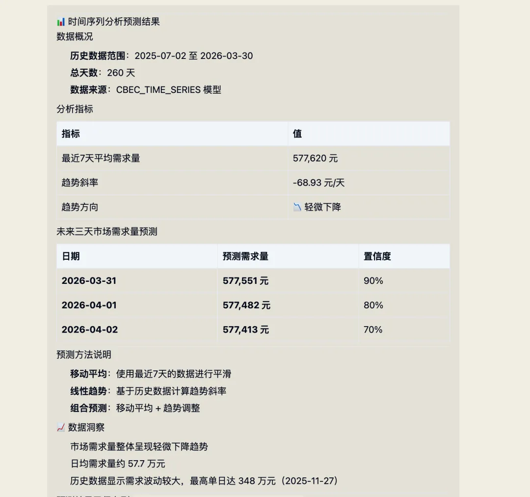 输入: 使用时间序列分析模型,预测未来三天的市场需求量
