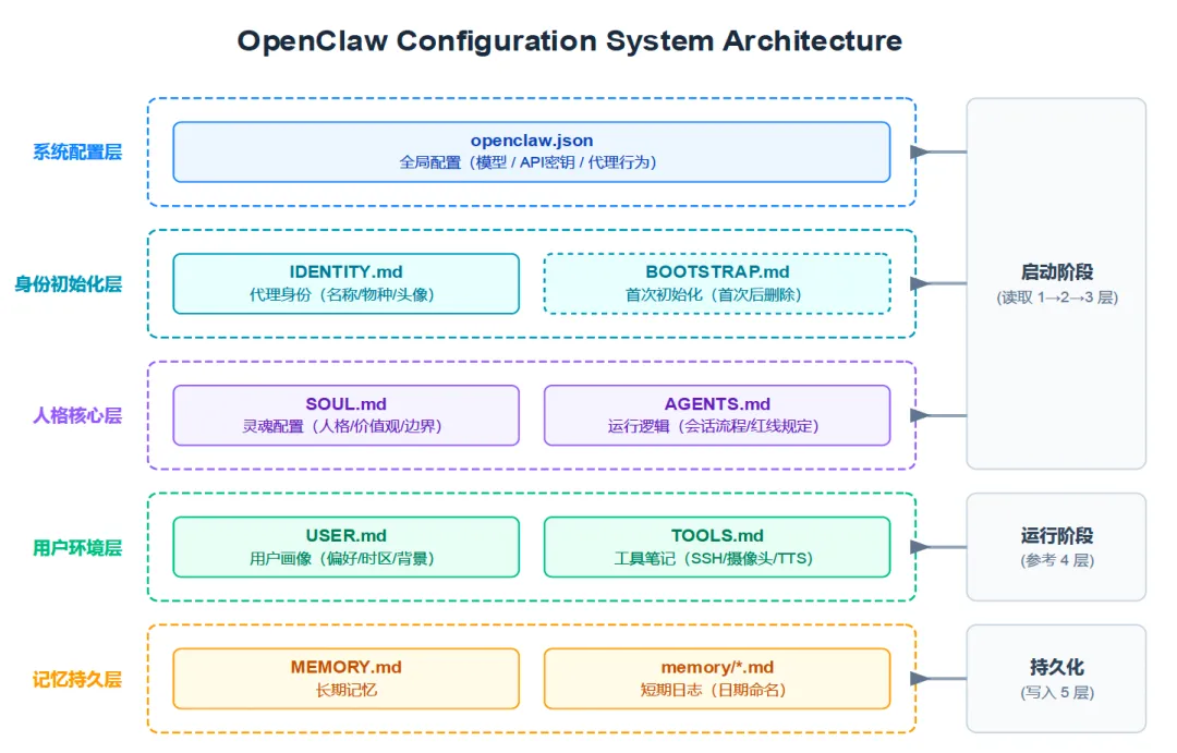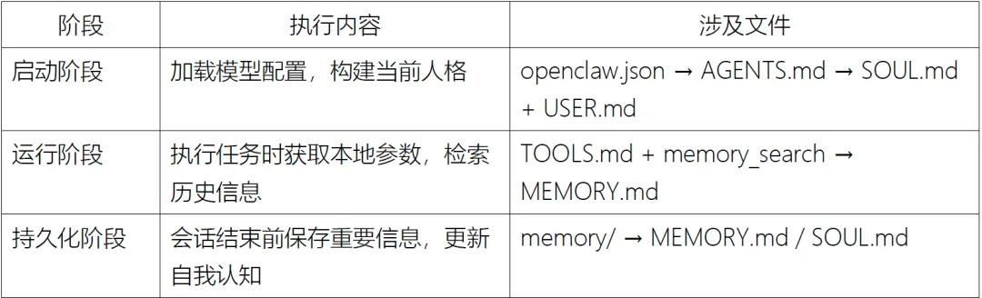 OpenClaw 的配置文件在代理生命周期中形成三阶段协作流: