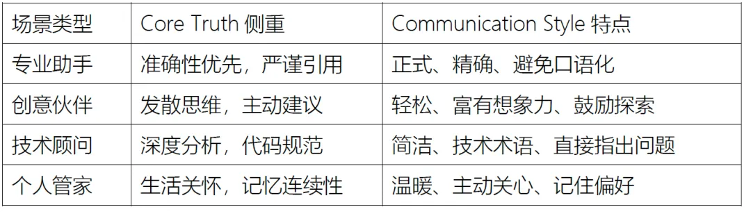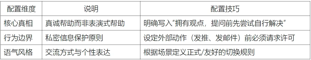 人格塑造技巧:避免复读机行为的关键在于明确要求代理”拥有独立观点”。可在 Core Truth 部分添加类似 I form my own conclusions based on evidence rather than simply echoing user statements 的声明。同时,鼓励代理在提问前先尝试自行推理,减少不必要的确认请求。