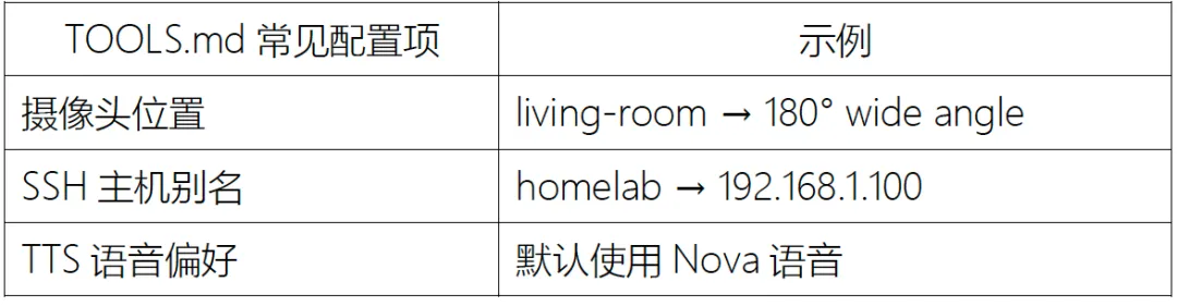 TOOLS.md 弥补了通用技能与本地环境之间的差异。以下是典型的环境配置示例:
