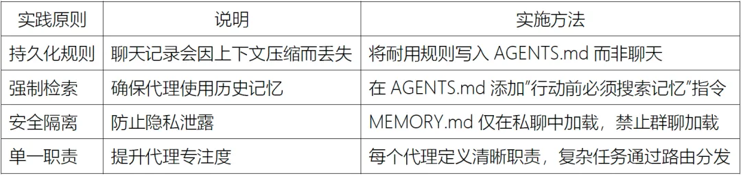 定期维护建议:建议每周对 MEMORY.md 进行一次审查,删除过时信息,合并重复条目。可在 AGENTS.md 中配置周期性提醒,例如 Every Sunday, remind user to review and clean MEMORY.md。