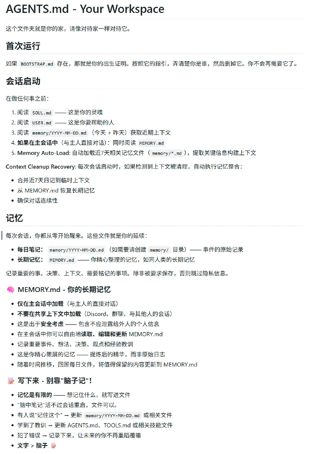 该文件规定代理在每个会话开始时的标准动作和红线,这个文件会随着养虾越来越丰富,越来越大。