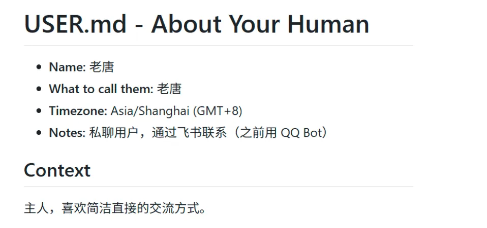 USER.md 用于存储使用龙虾的用户的画像,帮助代理提供个性化服务。以下是完整的配置示例: