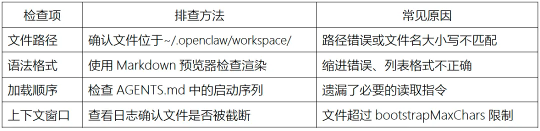 上下文压缩导致规则丢失的解决方案:OpenClaw 会对长对话进行上下文压缩(Compaction),这可能导致聊天中临时设定的规则丢失。解决方法是将所有需要持久化的规则写入 AGENTS.md 或 SOUL.md,而非仅在聊天中口头约定。关键规则应使用大写关键词(如 MUST、NEVER、ALWAYS)强调。