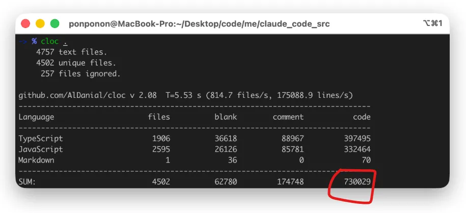 Anthropic 长期主打 Claude 代码编写与代码审计的强悍能力,结果自家代码却因为一个基础失误被曝光。该观点客观属实, Anthropic 从未将客户端交互逻辑列为机密,品牌真正的核心壁垒是 Claude 大模型本体,而非命令行工具。 开发者通过系统命令,即可直接查看本地安装包内全部编译后逻辑代码。