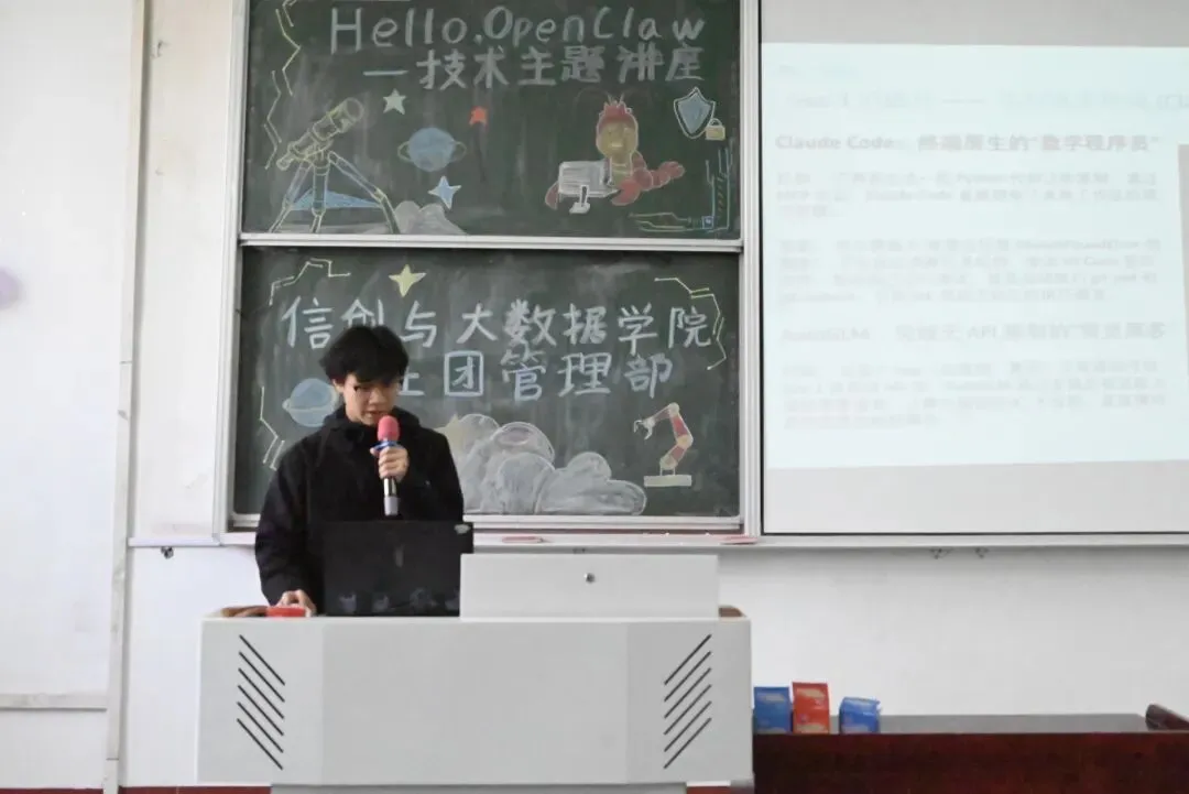 活动伊始,主持人介绍了AI技术的发展趋势,点明OpenClaw作为主流开源AI框架的独特优势,其“对话即执行”的特性,能够让AI成为高效完成自主任务的“数字员工”。随后,主讲同学围绕OpenClaw的技术原理、核心架构与实际应用场景展开细致讲解,用通俗易懂的语言拆解复杂知识点,帮助同学们快速搭建起对该技术的完整认知。