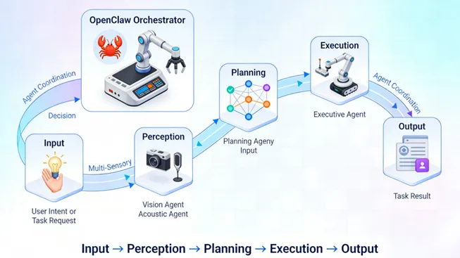 在具身智能语境下,OpenClaw可被理解为一个层级化控制体系中的核心枢纽:在感知层,它负责协调视觉、听觉、触觉等多模态感知Agent,整合环境信息;在规划层,它联动路径规划、动作规划等高级Agent,生成符合物理约束的行动方案;在执行层,它进一步调度机械臂、移动平台等执行模块,将决策转化为稳定、可控的物理操作。