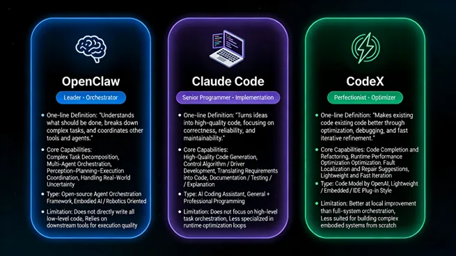 三者并非相互替代,而是形成了“调度编排—工程实现—优化兜底”的协同闭环。这种新的AI Coding分工格局,也为未来具身智能系统的大规模开发与部署提供了更清晰的方法论。