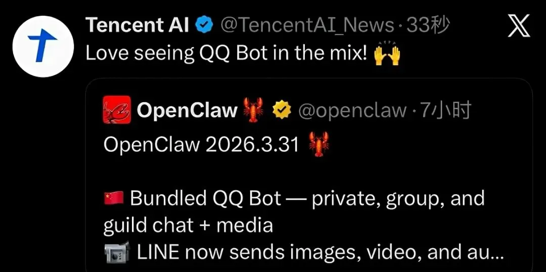 OpenClaw 20260331最新版本在渠道生态上迎来重要扩展——QQBot插件现已内置打包(充值过后待遇肯定不一样,SVIP必须楼上请),无需额外安装步骤即可接入腾讯 QQ 生态,覆盖私聊、群聊和频道三大场景。这是继企业微信、微信之后,OpenClaw 在腾讯系产品上的又一关键落点。