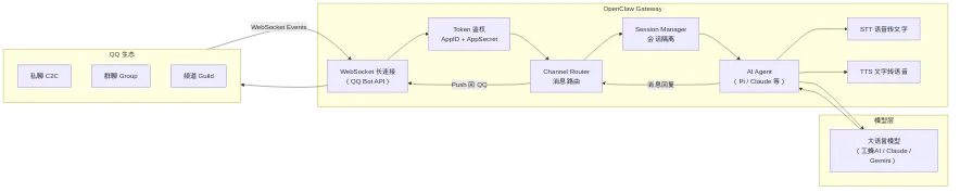 - 接入层:QQBot WebSocket 长连接负责接收来自 QQ 生态的事件(消息、@提及、语音等),同时将 AI 回复推送回对应会话。