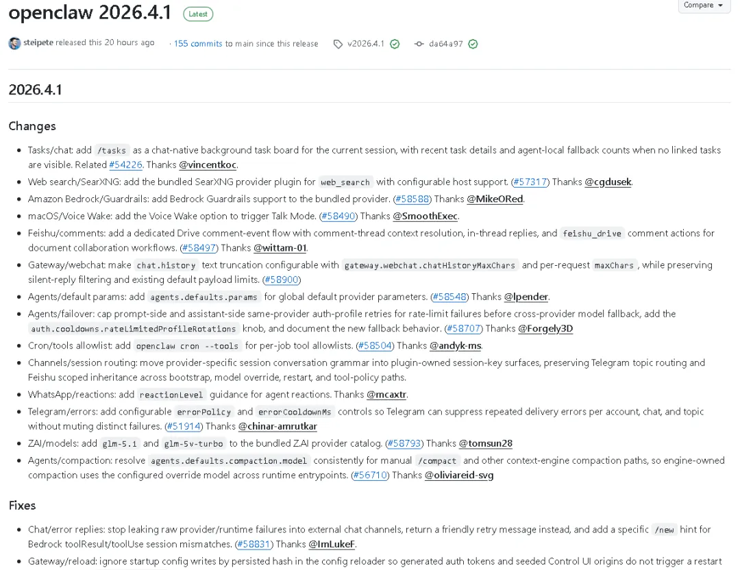 本次更新深度契合OpenClaw“安全可控、灵活适配、高效执行”的产品理念,所有新增功能与修复均基于社区反馈与实际场景需求打磨,既兼顾了普通用户的易用性,又满足了专业开发者的定制化需求。下面,我们将从核心功能新增(Changes)、关键问题修复(Fixes)、版本价值总结三大维度,对openclaw v2026.4.1版本进行全方位、无遗漏的深度解析,帮助大家全面掌握新版本的核心升级点与实际应用价值。
