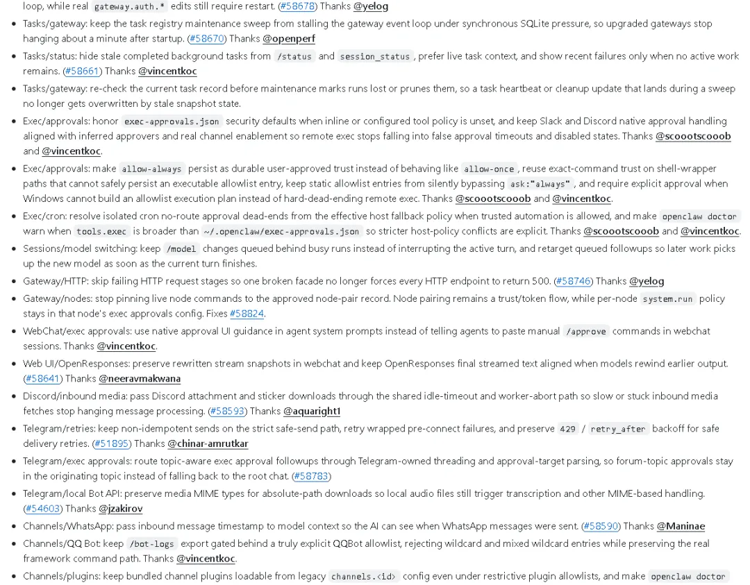 1. 默认权限对齐:当内联或配置的工具策略未设置时,严格遵循 exec-approvals.json安全默认值,避免权限越界;2. 跨平台审批统一:Slack与Discord原生审批处理逻辑对齐,确保推断审批人、频道启用状态一致,解决远程执行出现的虚假审批超时、禁用状态异常问题; 3. 持久化信任优化: allow-always权限改为持久化用户可信信任(非单次允许),支持shell包装器路径复用精确命令信任,修复静态允许列表布局问题,解决全局npm安装后LINE渠道启动失败问题。