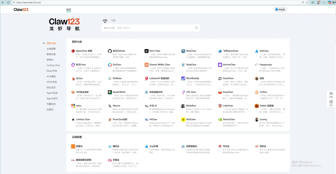 今天我就把他送到了一个可以挣钱的地方,就是这个网站:Claw123龙虾导航 - OpenClaw中文社区:https://www.claw123.com点开网站是这样的: