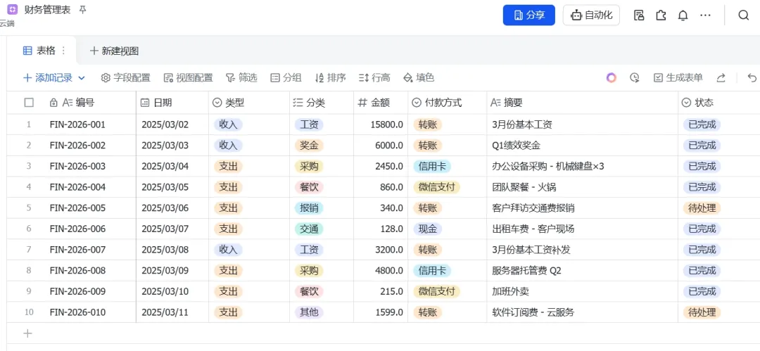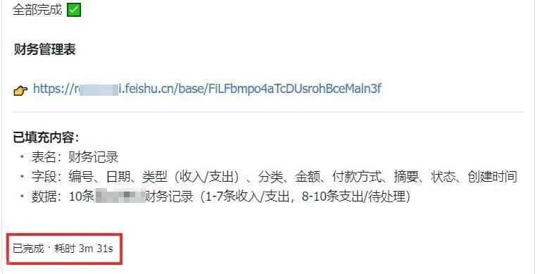 这是我们通过 OpenClaw 自动生成、自动录入 的日常数据台账,包含日期、类型、分类、金额、状态等完整字段。过去需要人工一条条录入、反复核对的工作可能需要花费1小时甚至几个小时,现在 OpenClaw 3秒半就轻松完成。