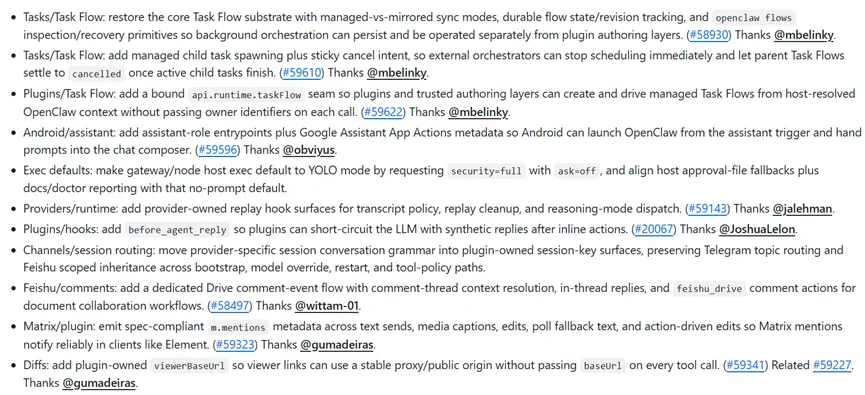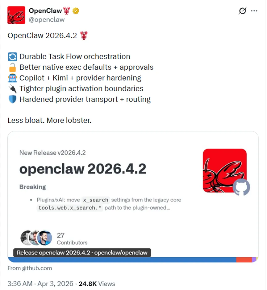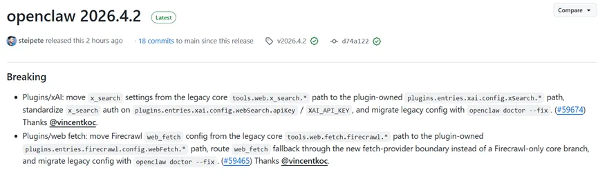 地址:https://github.com/openclaw/openclaw/releases/tag/v2026.4.2