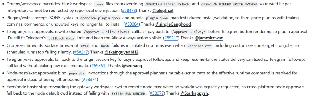 网关和执行相关的 bug 也修了不少,比如之前 2026.3.31 版本后,本地执行和节点客户端会因为配对问题报错,这次恢复了旧的角色降级逻辑,还允许本地角色静默升级,再也不会出现莫名的配对错误。