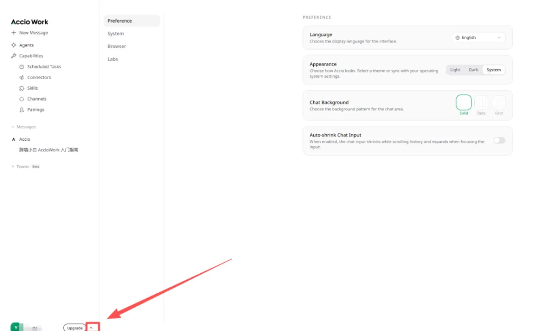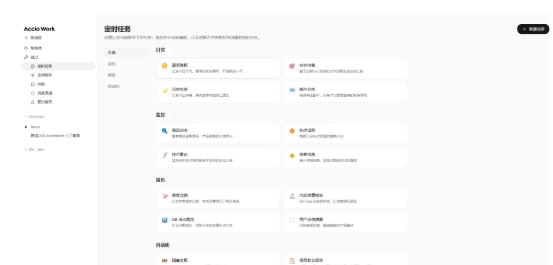 工具好不好用,先看它的交互面板。很多 AI 工具上来就是一个黑框命令行(CMD),直接把小白劝退。Accio Work 的入门门槛还算良心,图形化界面,没搞那些虚头巴脑的劝退动作。