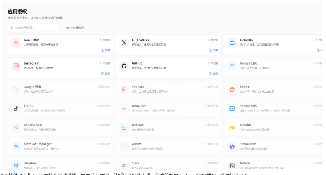 • 2.3 技能 (Skills):这是核心驱动模块,想要什么功能,就插什么技能卡带。就像给机器人换不同的机械臂,随时切换形态。