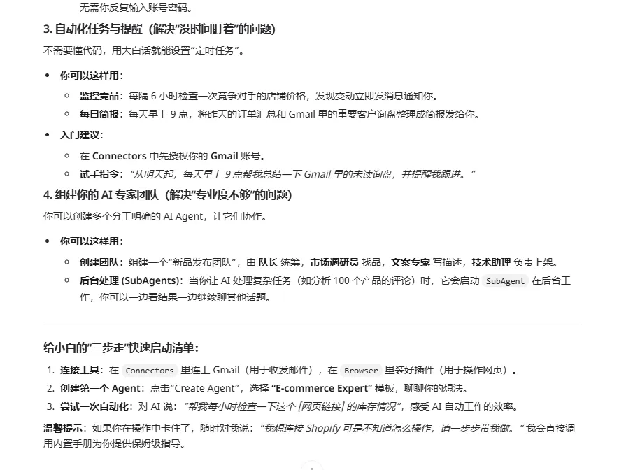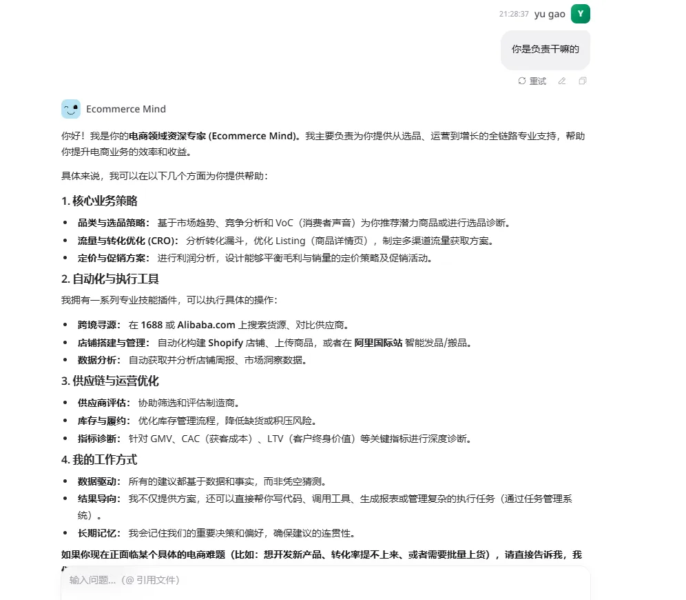 3.2 实机第二步:核心算力对决(与 Ecommerce Mind 对话)外部数据接通后,直接上高强度。调用内置的 Ecommerce Mind 开始深度对话。这就像是连上了专业的电商分析大脑,到底有没有真东西,跑几个复杂的数据分析任务就知道了。有什么复杂的运营问题,狠狠地往里面抛,看它能不能接得住!