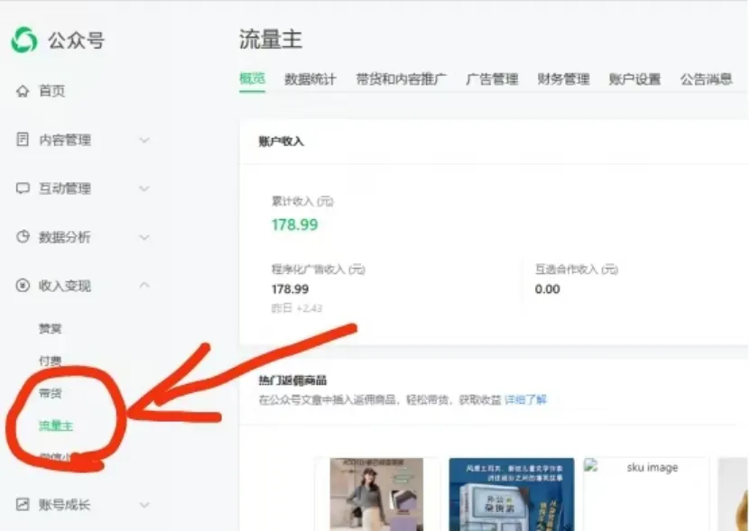 登录后 → 左侧菜单栏 → 点击【收入变现】→ 选择【流量主】