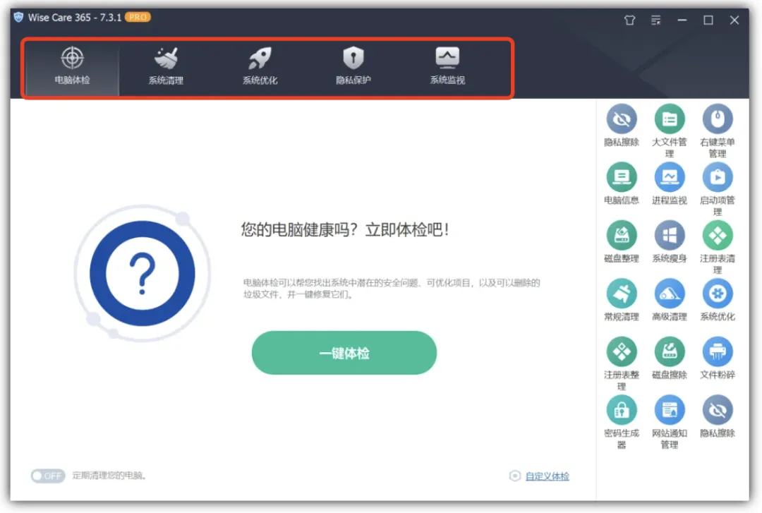WiseCare365(全称 Wise Care 365)是由一款一体化 Windows 系统清理、优化与保护软件,包含比如隐私擦除、大文件管理、系统瘦身、注册表整理等等功能。