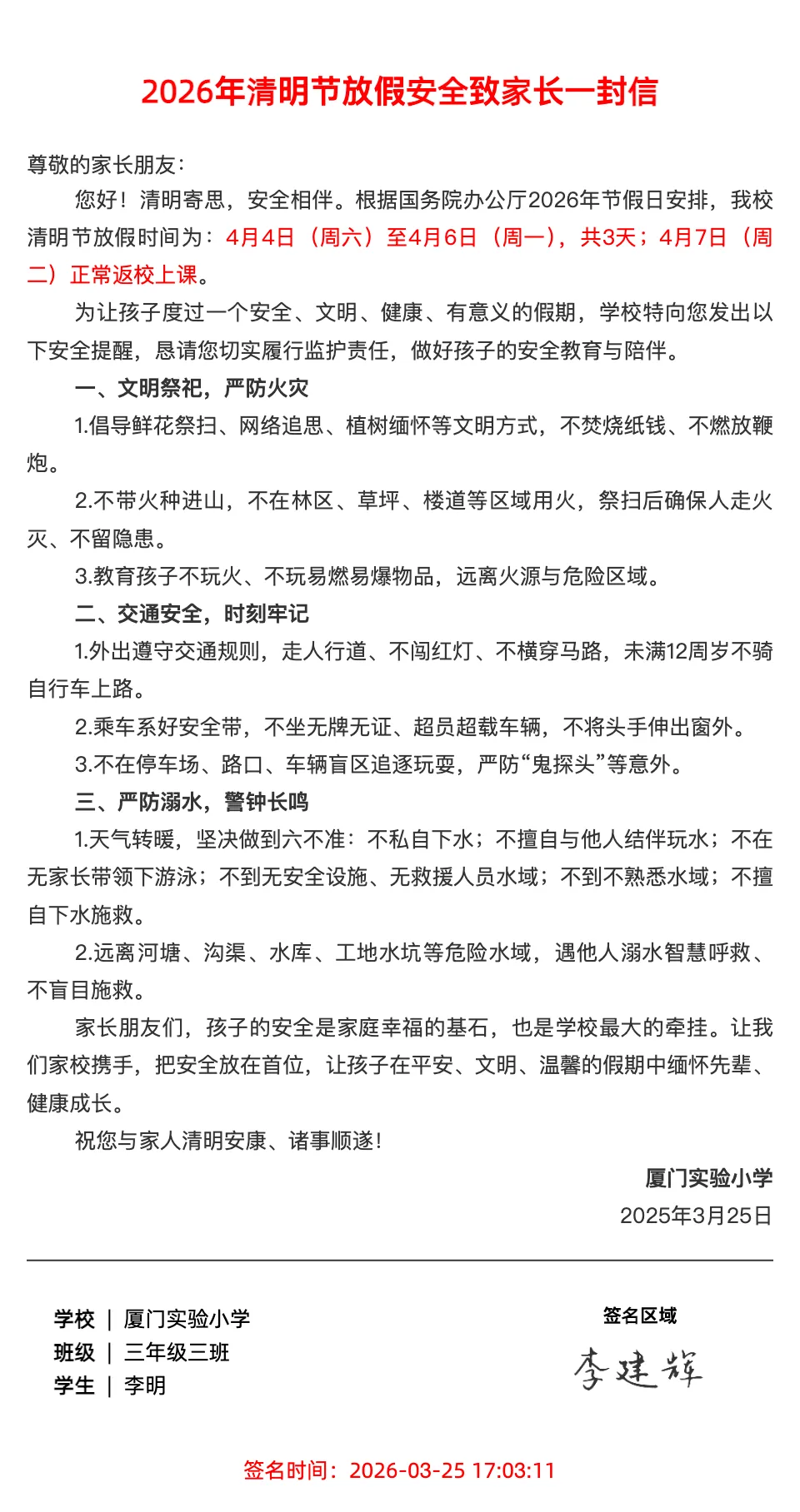 2026年春假及清明节放假安全致家长的一封信,家长电子签名回执单!
