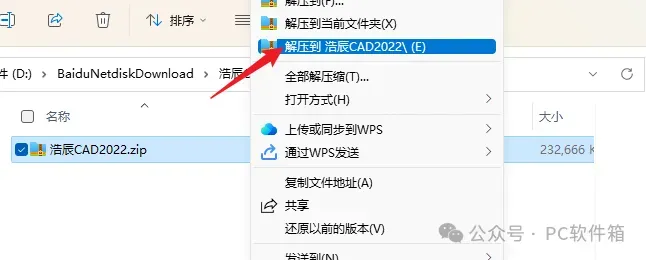1.解压安装包:鼠标右击【浩辰CAD2022】压缩包,选择电脑上安装的解压软件,点击【浩辰CAD2022】。